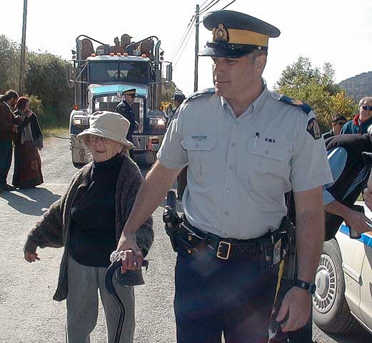 Arrested Protest and blockade of clear-cut logging on Salt Spring Island, BC Bee Neville, 86 years old arrested for blocking a logging truck.