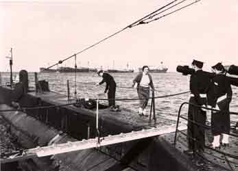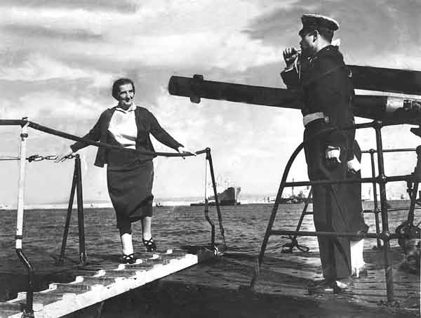 גולדה מאיר בביקור בצוללת. משמאל לתותח רס"ל אורי כוגן